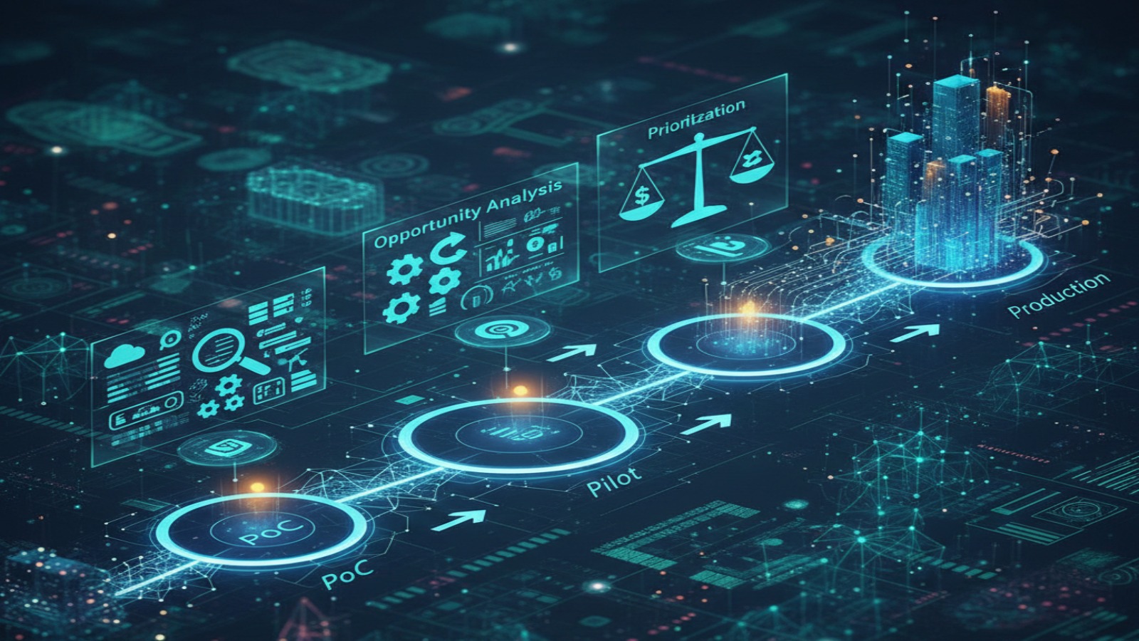 تحلیل فرصت‌ها، اولویت‌بندی موارد با بیشترین ارزش و طراحی مسیر مرحله‌ای (PoC → Pilot → Production).