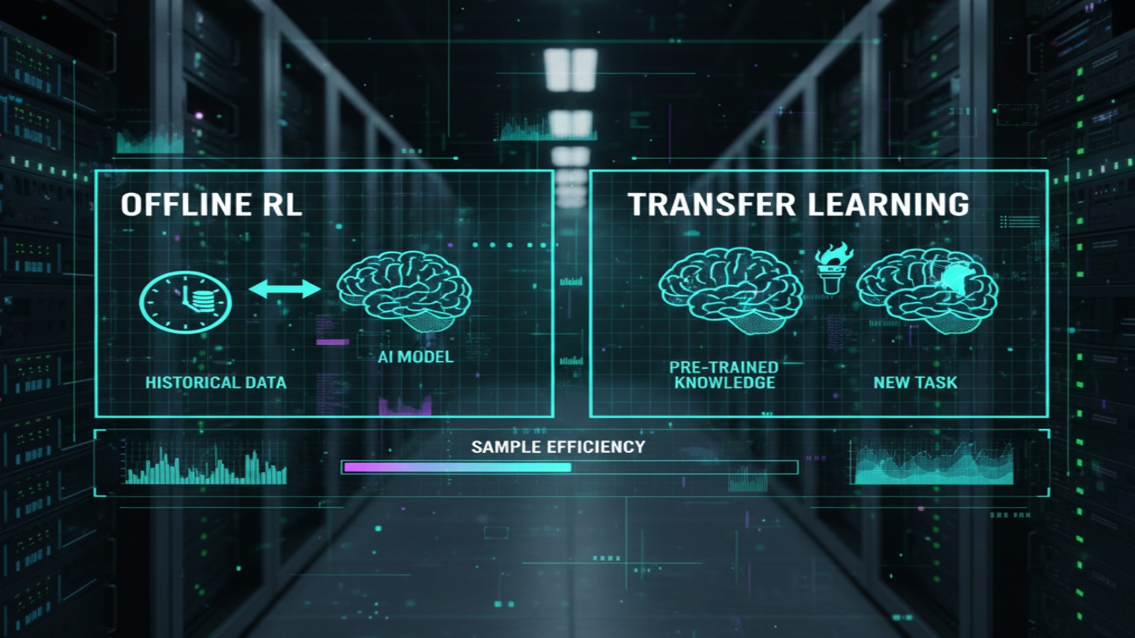 استراتژی‌های افزایش کارایی نمونه‌ای (Sample Efficiency) شامل استفاده از داده‌های تاریخی (Offline RL) و انتقال یادگیری (Transfer Learning).